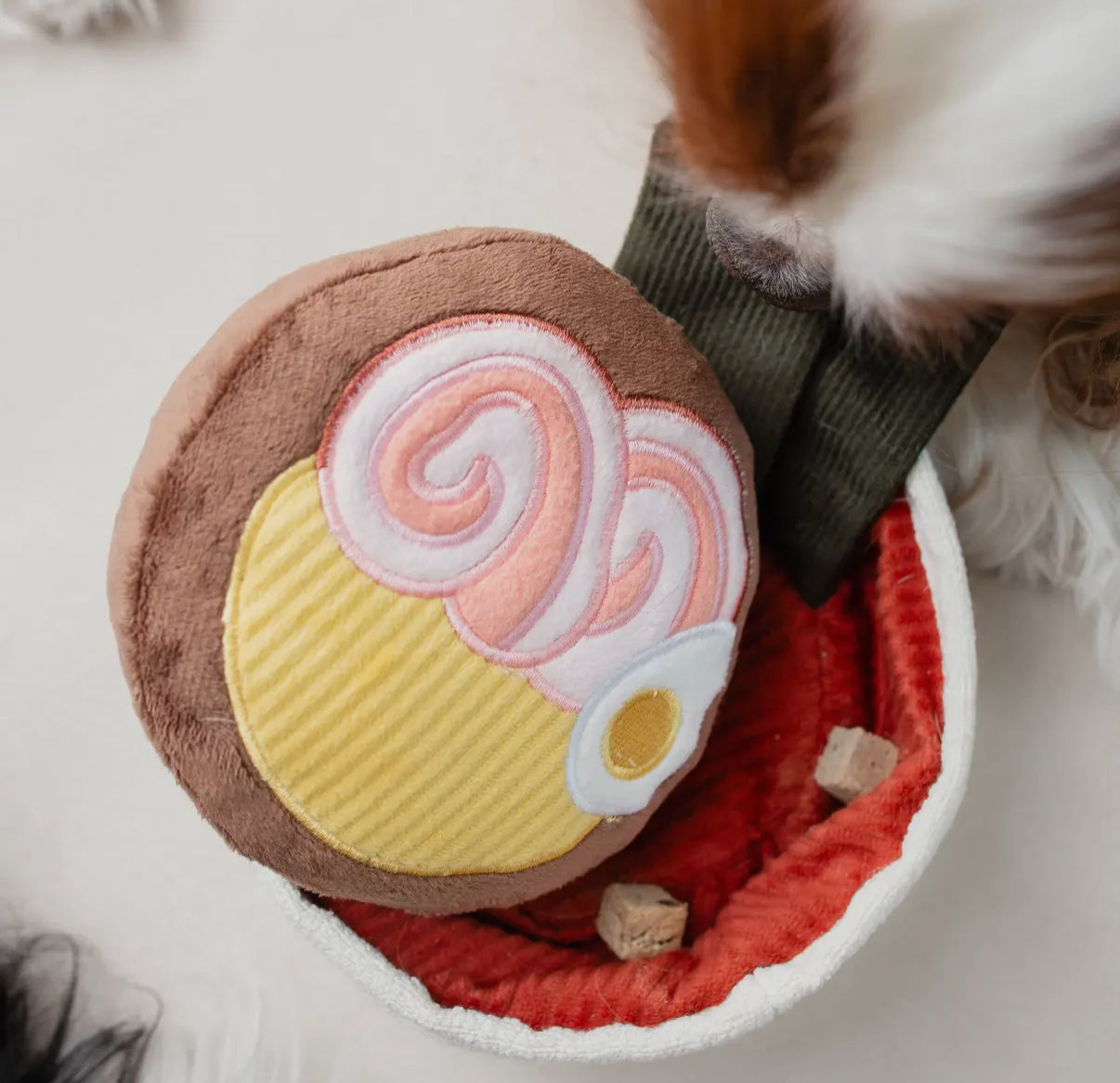 Treat your pup to a bowl of fun with our snuffle Ramen! This adorable, interactive toy is packed with a squishy noodle base and all around it is are space to hide treats of different sizes! The noodle base is squeaky with the seaweed on the side crinkly. It is perfect for keeping your furry foodie entertained and engaged. Serve up some tail-wagging joy with every sniff, search, and snack!